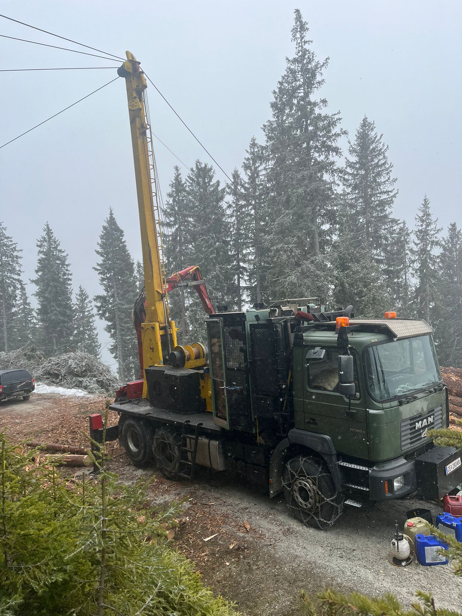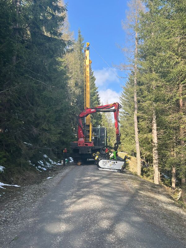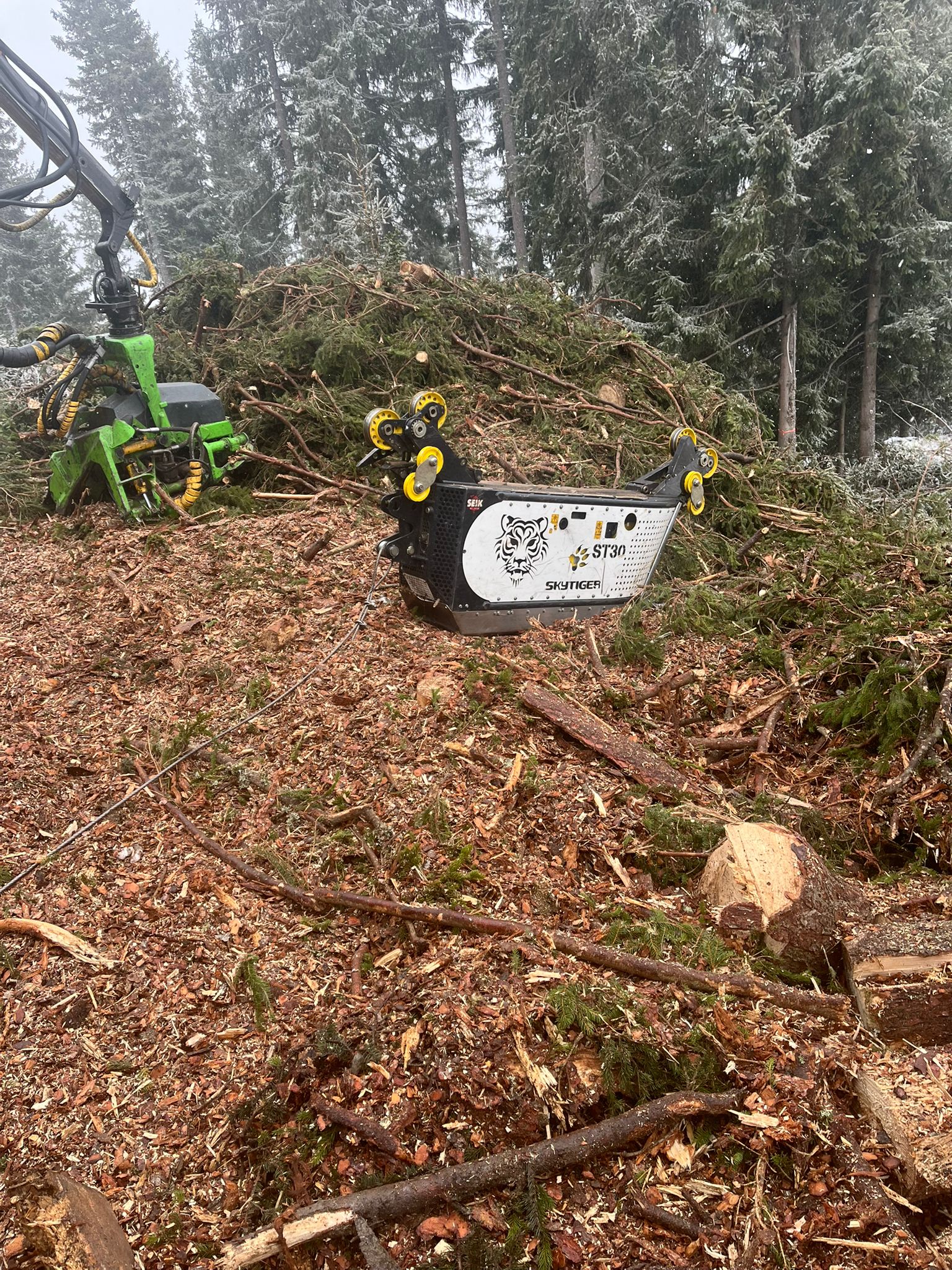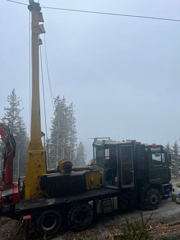 Seilkran für bergauf und bergab, Streckenautomatik mit 2 Sendern, kann von der Kabine aus gefahren werden oder man sitzt im Bagger je nach Bedarf. Bergauf kann mit Rückholseil und Zugseil zusammen bergauf gezogen werden. Seik 30, Bj. 2022, 3.500 h mit Kunststoffseil. Seilkran 18.500 h, Penz Kran 17.000. Die Maschine befindet sich in einem tipptopp Zustand. Wir haben auch vor kurzem ein Video gemacht, auf YouTube 'Seilkran PKM 6' eingeben, dann kann man es ansehen. Harvester Aggregat Lako 53, Bj. 2014, Inbetriebnahme 2017, Tragseil 650 m.