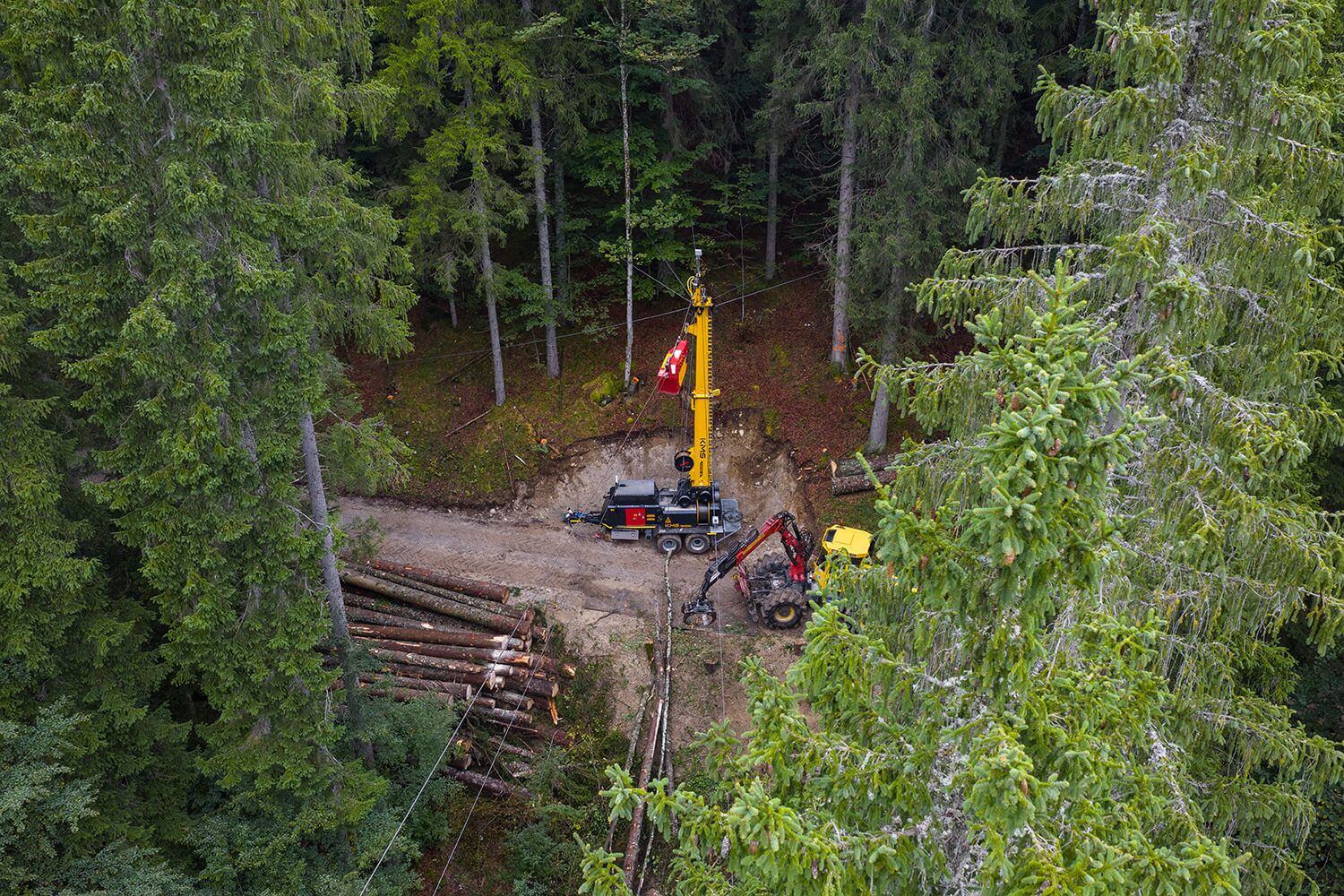 Das kompakte Kippmastsystem (KMS) KM40-3 ist eine funkgesteuerte Seilkrananlage, welche auf einem Tandemanhänger montiert ist. Sie verbindet einen hohen Grad an Arbeitssicherheit mit hervorragender Produktivität und ist dabei äußerst flexibel was den Wechsel des Einsatzortes betrifft. Sämtliche Maschinenfunktionen werden mittels Funkfernsteuerung ausgeführt, was die Rüstzeiten bei der Seilbahnmontage erheblich verkürzt. Ist die Seilkrananlage erstmal aufgestellt und in Betrieb, überzeugt das KMS dank hoher Laufwagengeschwindigkeiten und Komfortfunktionen wie Streckenautomatik und automatischer Funkübergabe mit seiner Leistung. Ein optionaler hydraulischer Hilfsantrieb unterstützt das Zugfahrzeug beim Erreichen des Einsatzortes. Durch die komplette Eigenversorgung des Hilfsantriebs durch das Hydrauliksystem des KMS steht dem Zugfahrzeug dessen gesamte Leistung zur Verfügung.